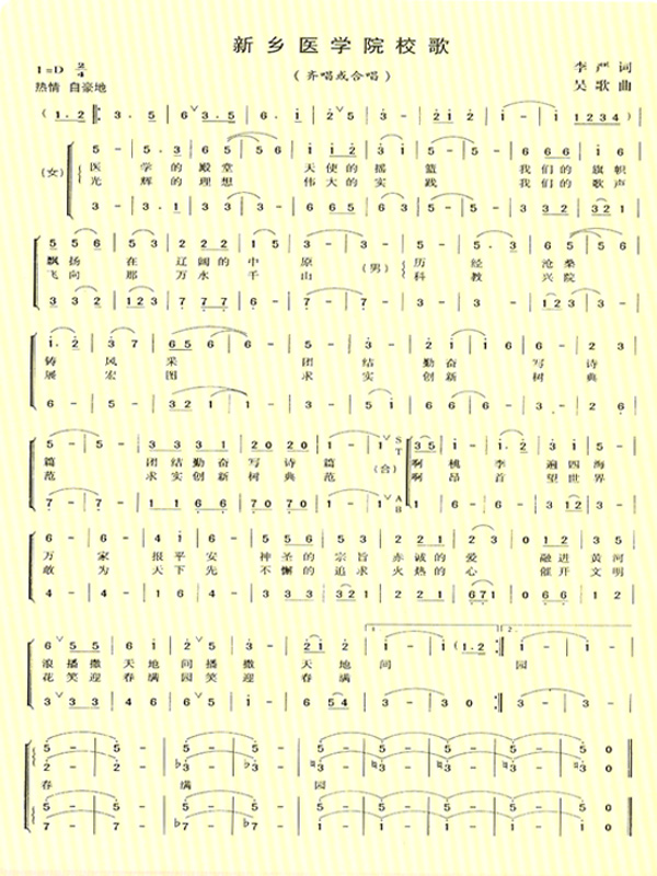 校歌以明快、激昂、热情豪迈的乐曲,形象、凝练、琅琅上口的语言,把新乡医学院的地理位置、办学宗旨、校训内容、社会作用生动形象的表现了出来,抒发了新医人自信、豪迈的情感。